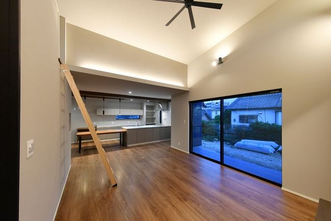 空気の流れを整えるシーリングファンと、やわらかく灯る間接照明が