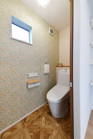 トイレには華やかな花柄クロスを取り入れ、
